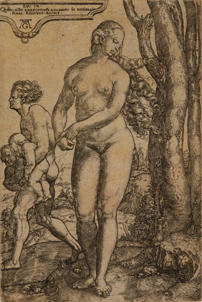 Über das WerkZwar erlebte die Darstellung von Nacktheit in der Renaissance eine Blüte, doch wurden die weiblichen und männlichen Geschlechtsmerkmale zumeist von Lendentüchern, Blattwerk oder einer über die Scham gelegten Hand verdeckt. Die in Heinrich Aldegrevers Kupferstich kunstvoll ins Bild gesetzte Schambehaarung ist für diese Zeit eine Seltenheit. Zu sehen ist die Königstochter Rhea Sylvia, dem Mythos nach Mutter von Romulus und Remus, den Begründern von Rom. Aldegrever zählt zu den bedeutendsten Kupferstechern und Malern der Renaissance nördlich der Alpen.