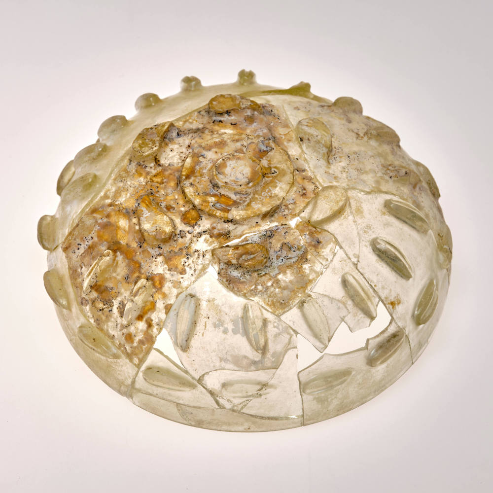 Über das WerkStellen die gekerbten Verzierungen dieser Schale etwas dar? Getreidekörner womöglich? Dafür gibt es bislang keine Vergleichsbeispiele. Die Art des Reliefs, vor allem das Doppelscheibenmotiv unter dem Boden, entspricht Gefäßen, die in Kleinasien im Reich der Sassaniden entstanden sind. Das Reich hatte sein kulturelles Zentrum in Iran, die hoch entwickelte Glasherstellung erfolgte aber nach heutiger Kenntnis in Mesopotamien (Irak) und wohl auch im Kaukasus (Georgien, Armenien, Aserbaidschan).