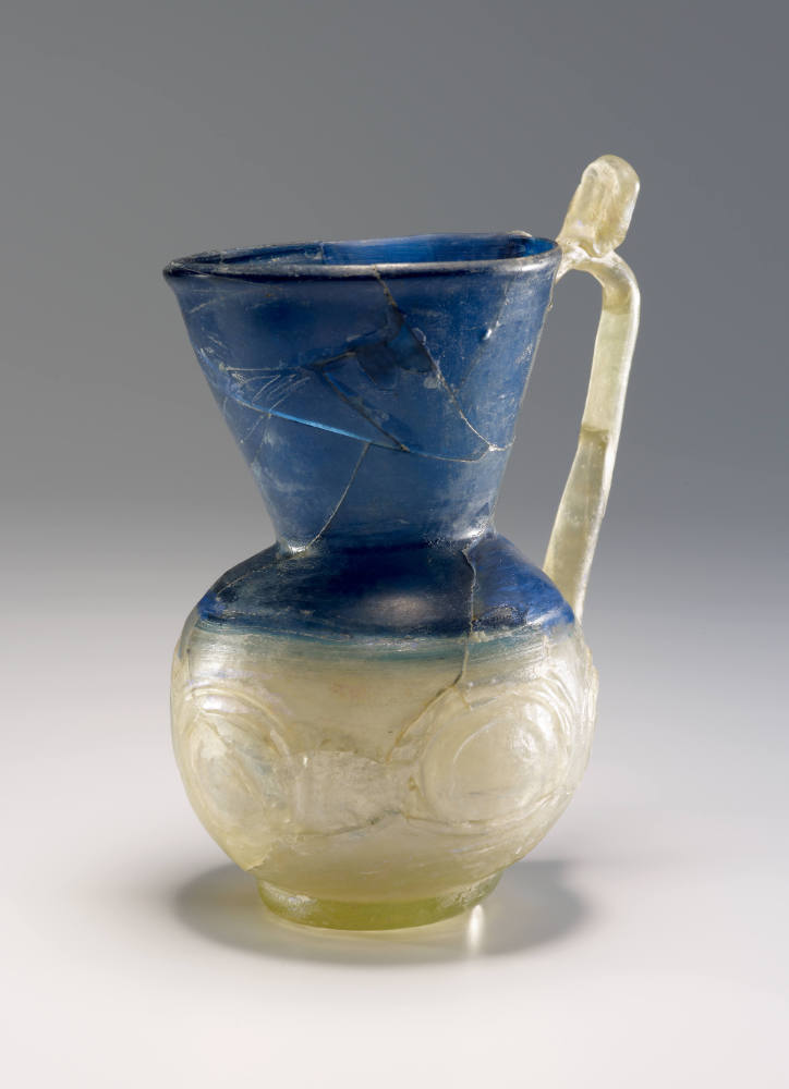 ausgestellt, Raum G 04 Über das WerkDie zwei Farbhälften dieser Kanne mussten in heißem Zustand miteinander verschmolzen werden. Dies erforderte höchste Genauigkeit und Beherrschung und wurde sicherlich nur von wenigen Werkstätten – womöglich sogar nur von einer einzigen – praktiziert. Entsprechende archäologische Funde sind über die Türkei, Syrien und Iran weitverbreitet. Sie zeigen die hohe Beliebtheit, geben aber kaum Aufschluss über die Herstellungsregion.