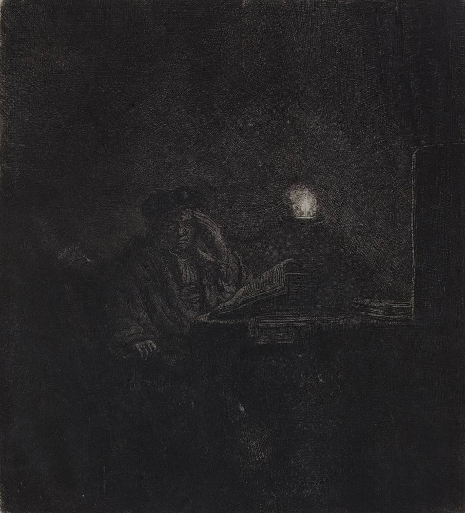 About the workThe quality of Rembrandt’s etchings becomes clear in this work. At first glance, the image seems to be almost entirely black. But then the viewer’s eyes become accustomed to the darkness; starting from the light of the candle, the seated figure and the open books can be examined. The deep black results from innumerable precise hatchings on the printing plate – the artist’s signature at the bottom right is barely legible between them. The Dutch artist realised numerous prints that were copied and imitated on multiple occasions, even during his lifetime.