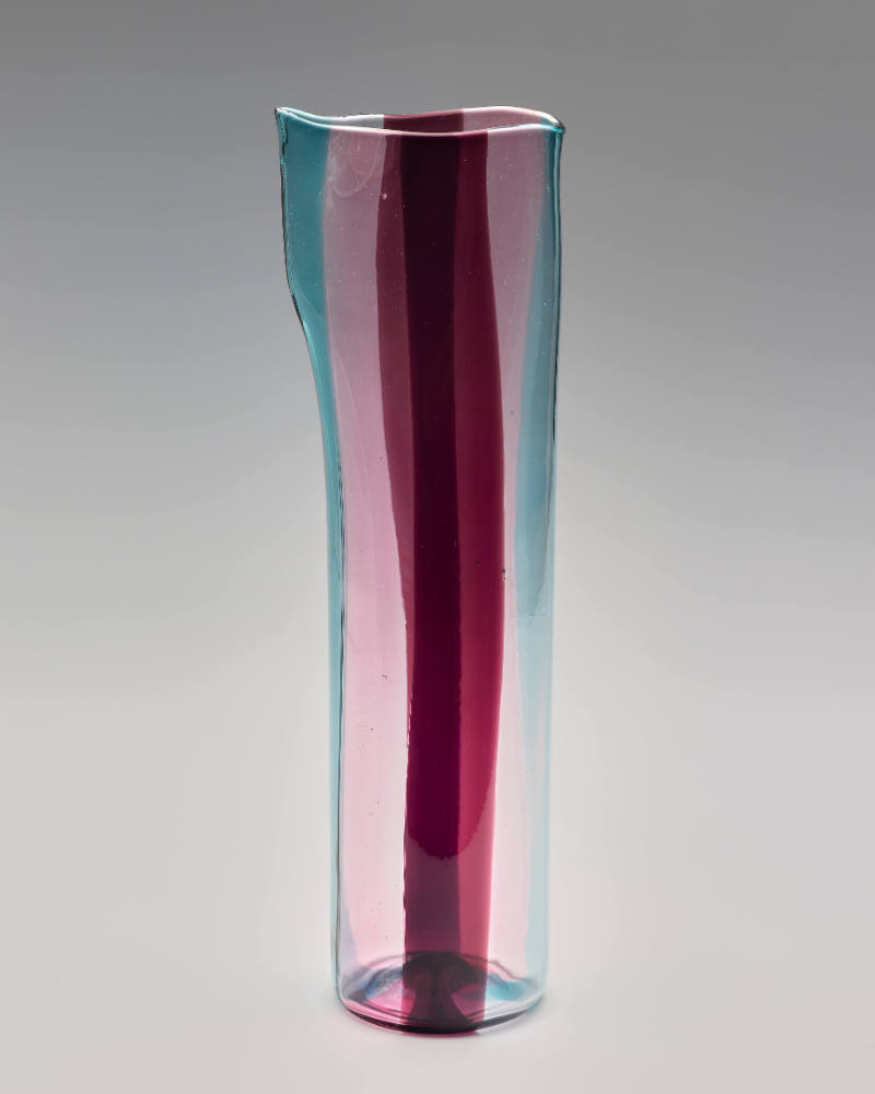 About the workA tiny notch turns a cylindrical vase into a jug. The spout varies on comparable pieces—obviously precision was not the aim here. This gives the vessel a personal touch and sets it against the industrial design of the time. The “spicchi” series—slices or carvings, or pieces of fruit—is said to be the work of both the graphic designer and illustrator Fulvio Bianconi and the designer and architect Massimo Vignelli. Both worked in Milan and created designs for the Venini glassworks.