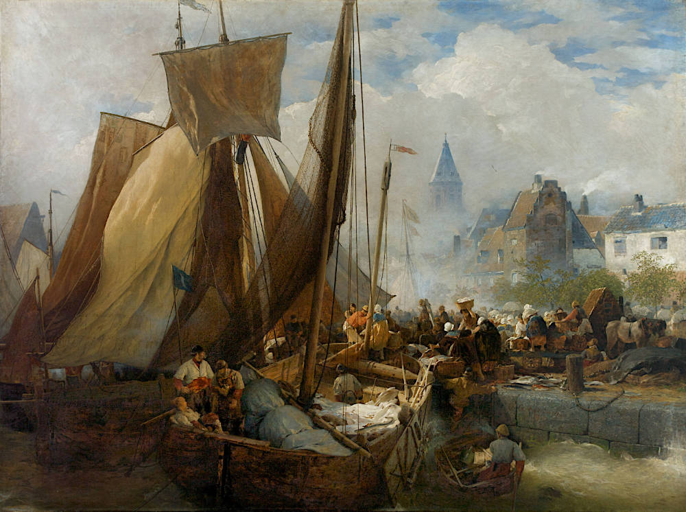 About the workDüsseldorf artist Andreas Achenbach painted many views of the Belgian and Dutch coasts. He was known for the dramatic use of light in his works. In an art journal of the time, this depiction of the fish market in Ostend was described as having "a fervour of colour and luminosity that far surpasses the achievements of his contemporaries". The effect of this painting is also due to the large picture plane and the contrast between the sizeable sails and small details. Such formats were explicitly created to be impressive exhibition pieces.
